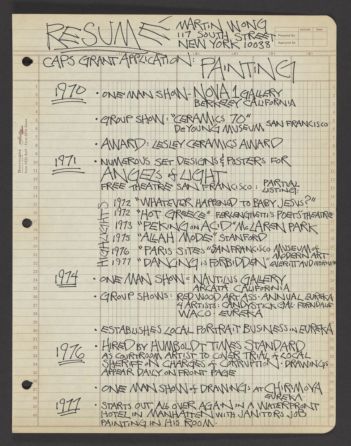 Series IV: Biographical contains material related to Wong's life and personal. The series includes Wong's curriculum vitae, artist profiles, a copy of Wong's birth certificate and high school reunion program, and his poetry and prose.